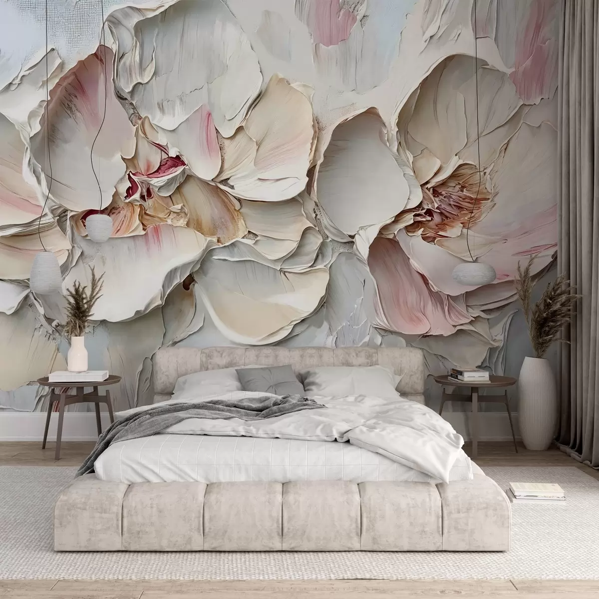 Шпалери Ніжні ніжно-рожеві квіти з м'якими шаруватими пелюстками на приглушеному, фактурному тлі, що імітує олійний живопис імпасто w08467