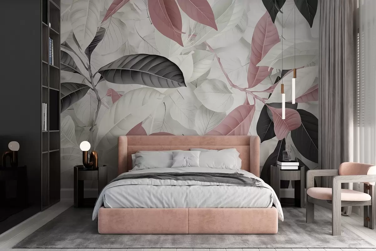 Фотошпалери Великий принт рожевого та сірого листя на світлому тлі з текстурою листя, що створює відчуття пишної тропіки w08468