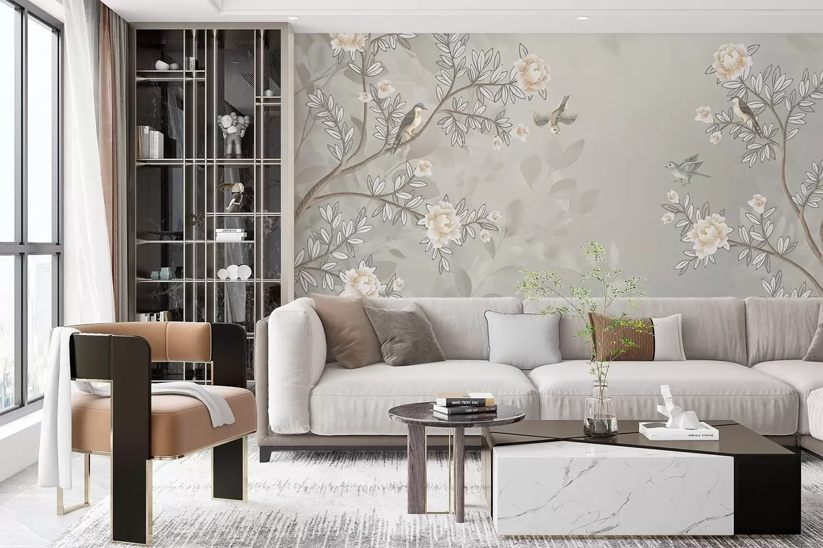 Фотошпалери Гілки з трояндами та птахами у світлих тонах w08493