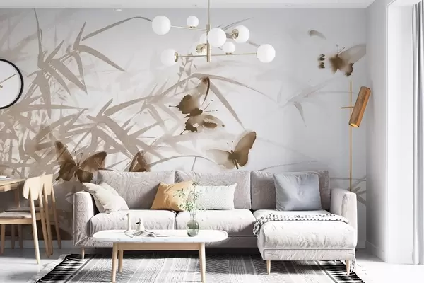 Фотошпалери Текстуроване бамбукове листя і стебла з літаючими коричневими метеликами з прозорими крилами w08524v1