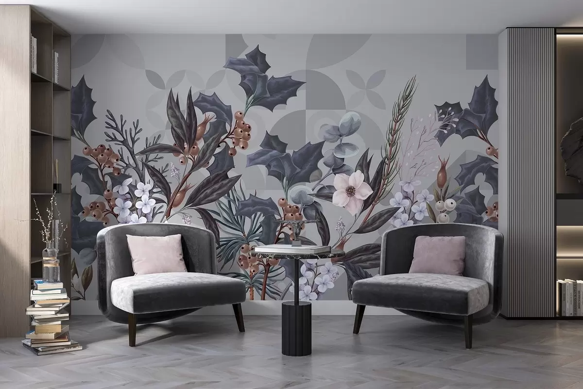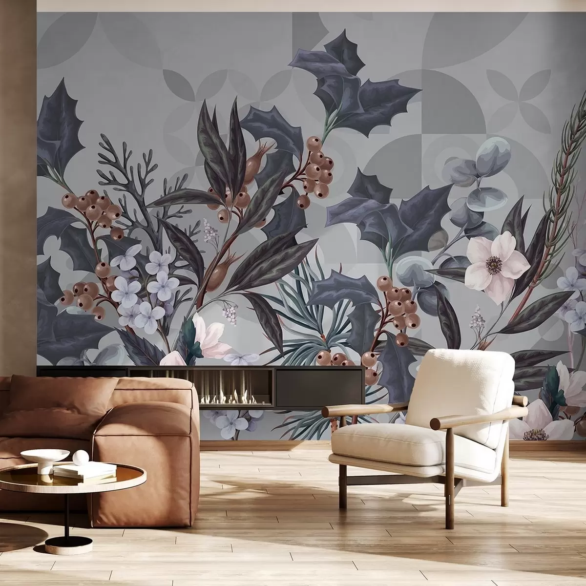 Фотошпалери Квіткова композиція з великим темним листям, квітами та ягодами на приглушеному сірому геометричному абстрактному тлі w08525