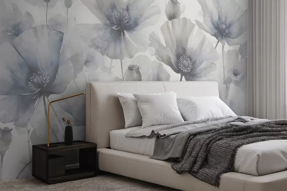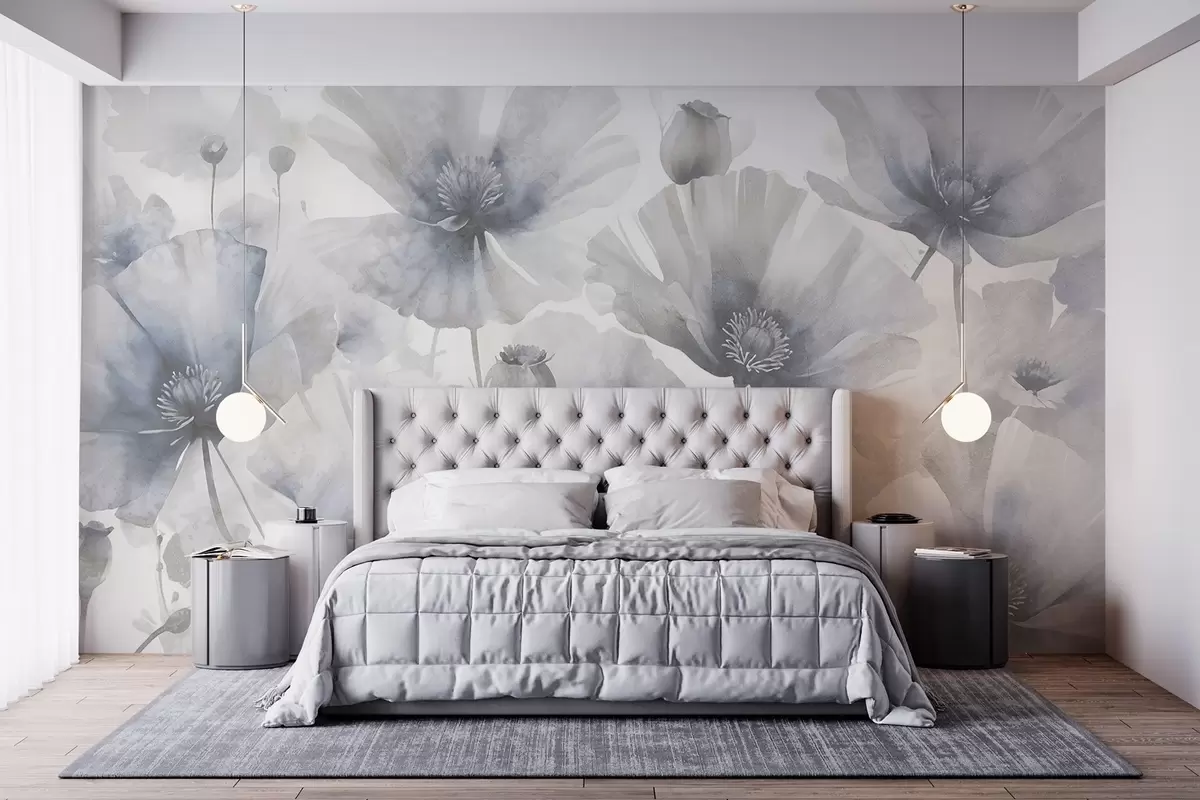 Шпалери Ніжні фактурні гранжеві сіро-білі квіти з м'якими, розмитими пелюстками на білому тлі w08526