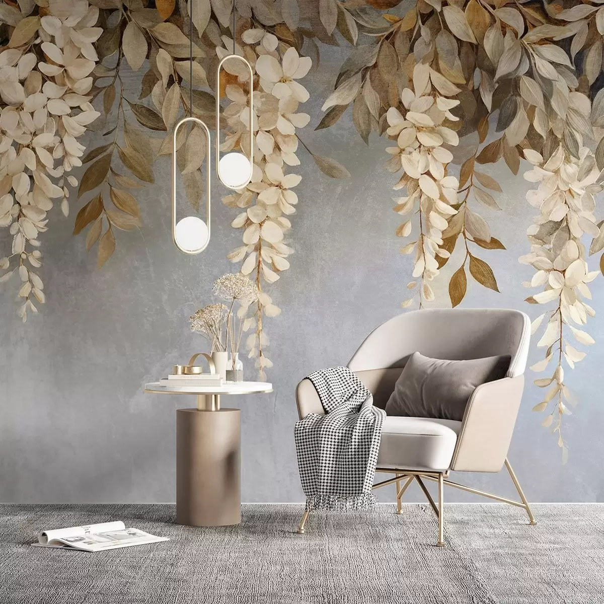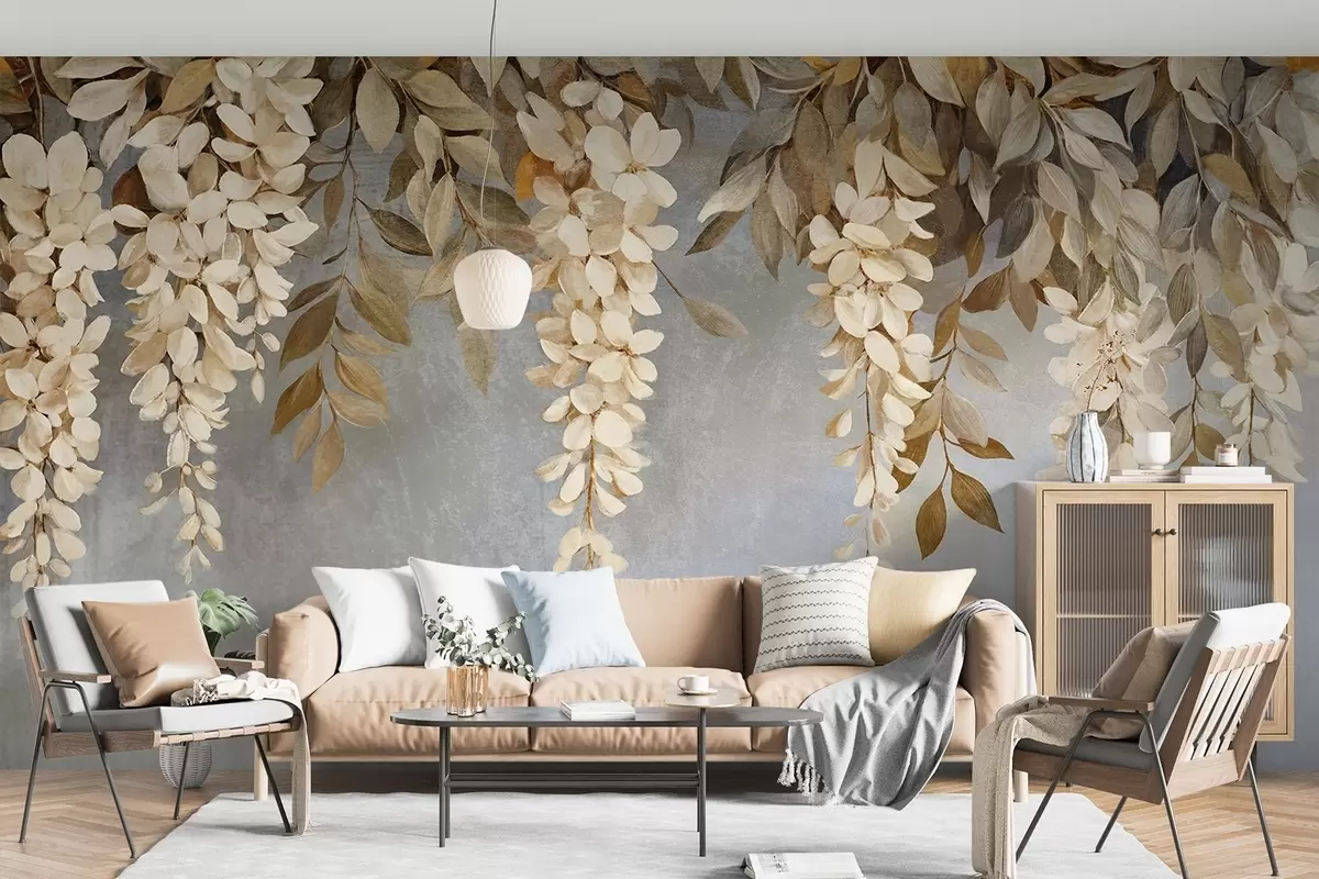 Фотошпалери Ніжні білі та світло-бежеві квіти гліцинії з листям, що каскадом спадає вниз на м'якому сірому тлі w08531