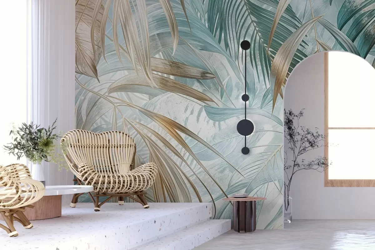 Фотошпалери Тропічний абстрактний квітковий принт з великим пальмовим листям у відтінках синього та бежевого створює пишну атмосферу w08532