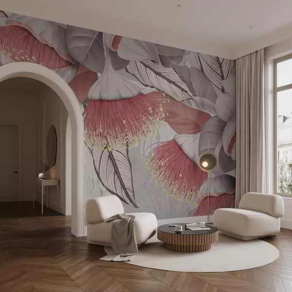 Фотошпалери Ботанічна ілюстрація великих квіток евкаліпта з довгими тичинками на сіро-білому тлі w08539