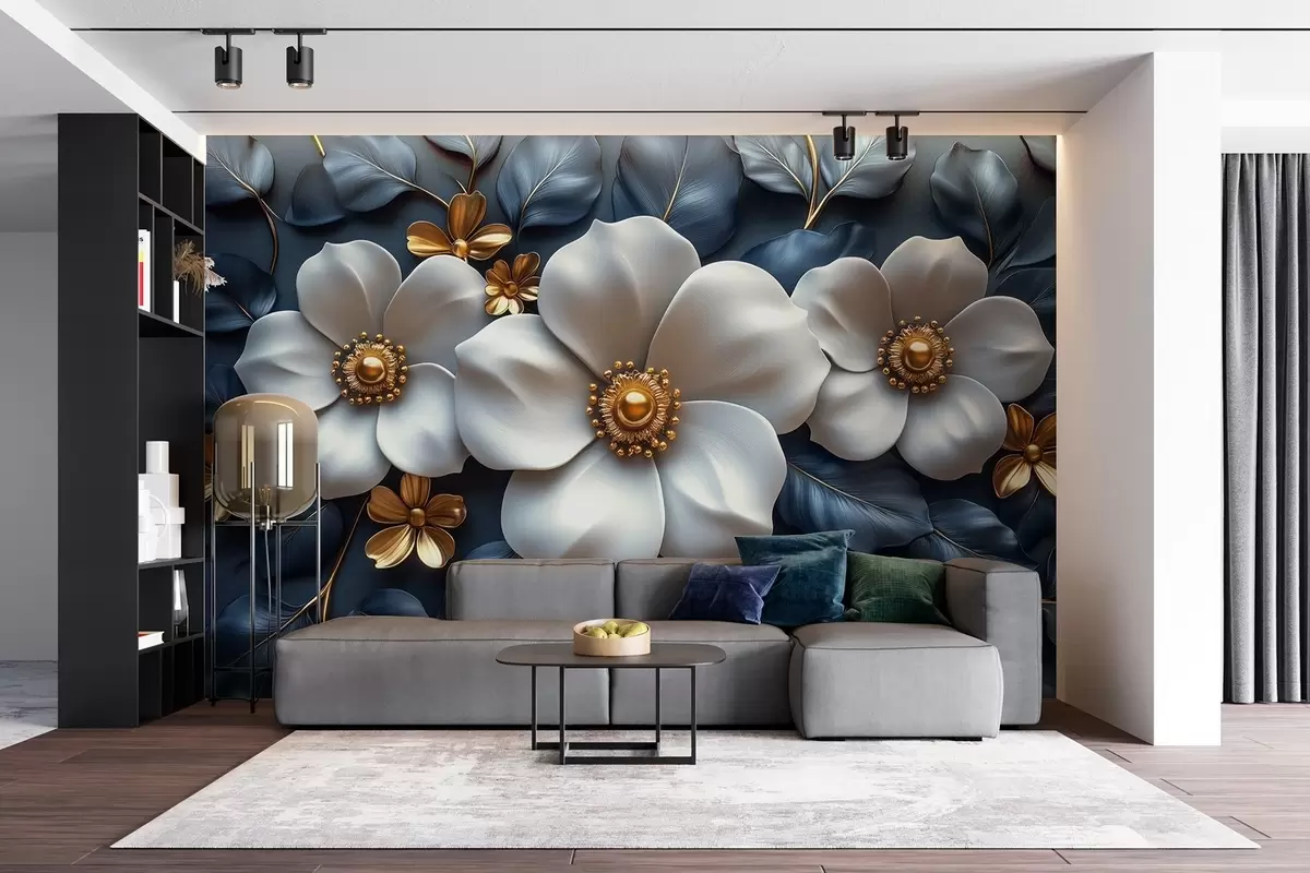 Фотошпалери Великі білі квіти на елегантному синьому тлі з листям w08559