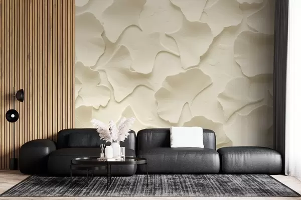 Фотошпалери Ліпнина з делікатним тисненням листя гінкго на м'якому бежевому тлі w08560