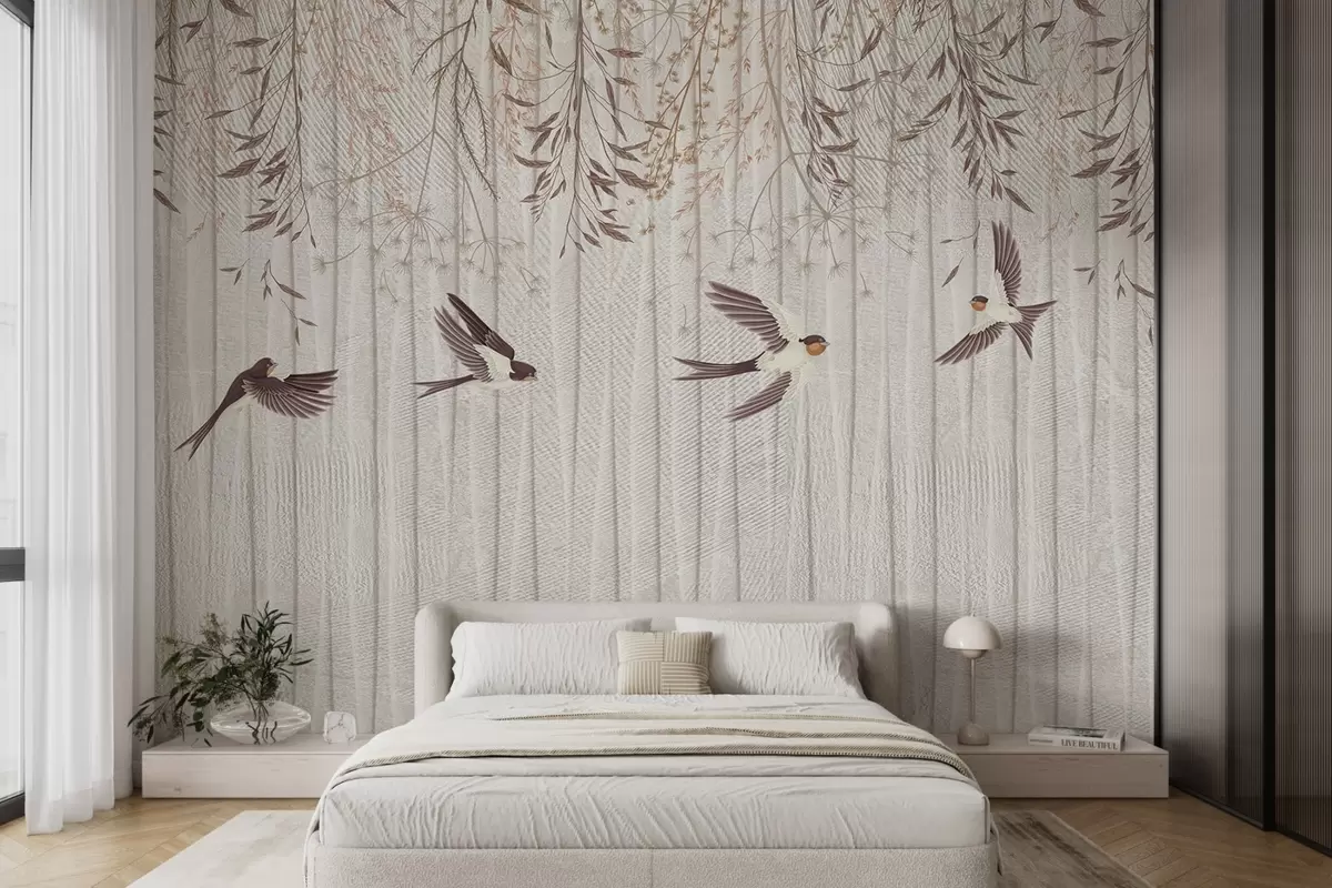 Фотошпалери Летючі птахи на фактурному тлі з кульбабами та квітами w08566