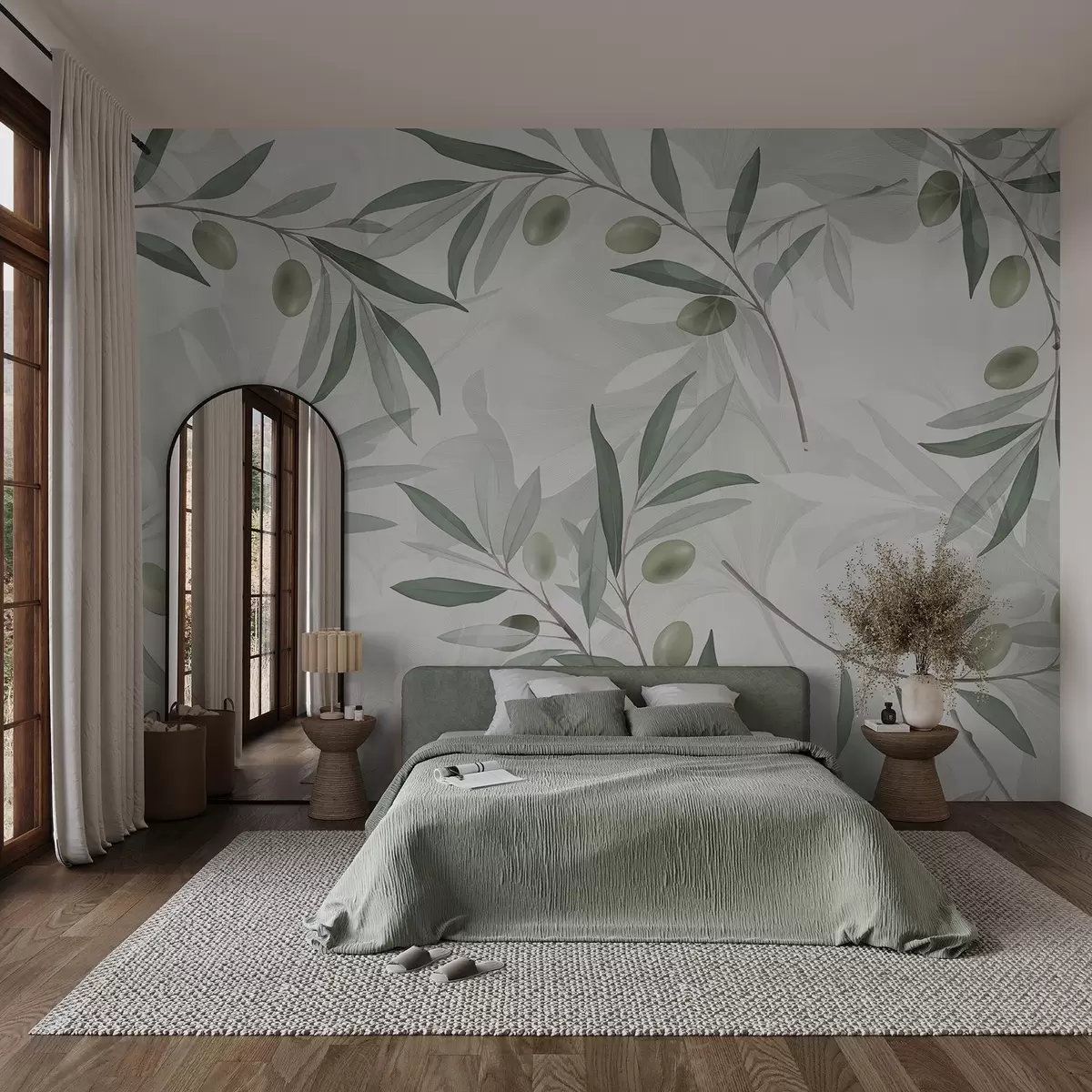 Фотошпалери Оливкові гілки з зеленим листям і оливками на світлому тлі w08576