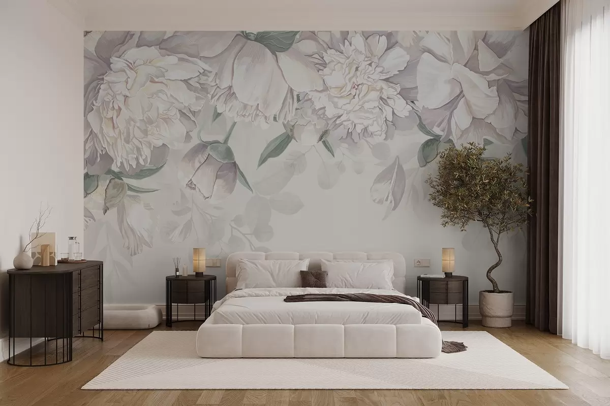 Фотошпалери Ніжні білі та рожеві пастельні півонії з зеленим листям, розташовані на м'якому, романтичному квітковому тлі w08577
