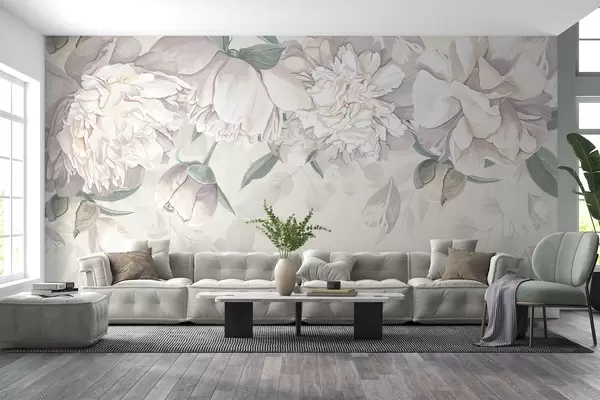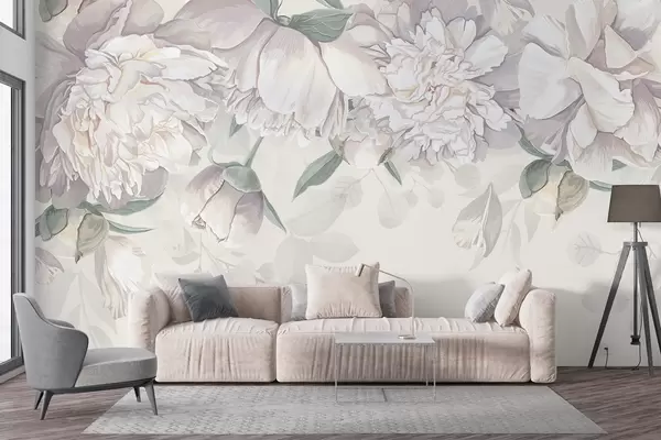 Фотошпалери Ніжні білі та рожеві пастельні півонії з зеленим листям, розташовані на м'якому, романтичному квітковому тлі w08577