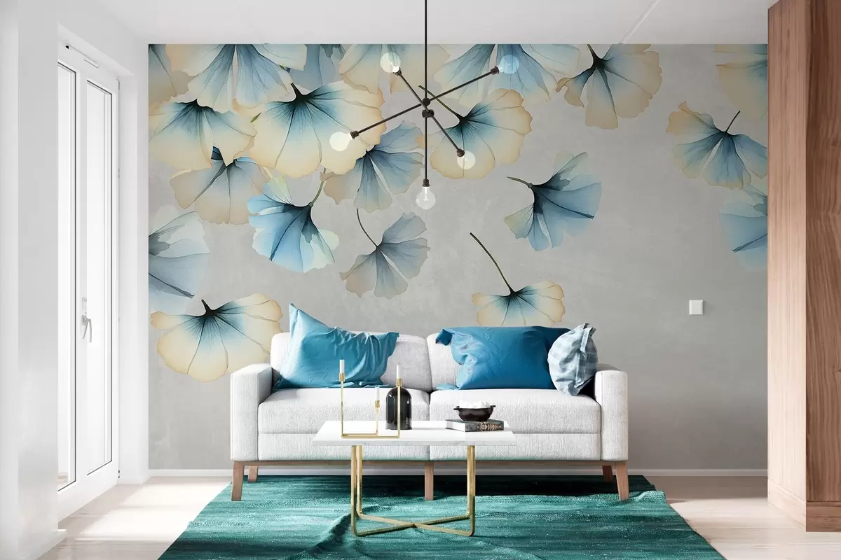 Фотошпалери Пастельні синьо-жовті листки гінкго з ніжними пелюстками, що ширяють у повітрі на текстурному тлі w08578v1