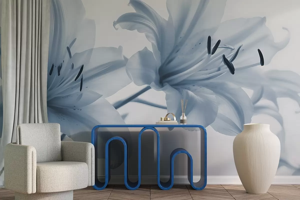 Фотошпалери М'який фокус крупним планом блакитних мінімалістичних квітів лілії на світлому тлі w08586