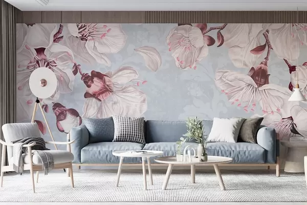 Фотошпалери Квітковий принт з великими рожевими та білими квітами вишні на світло-блакитному фактурному тлі w08601