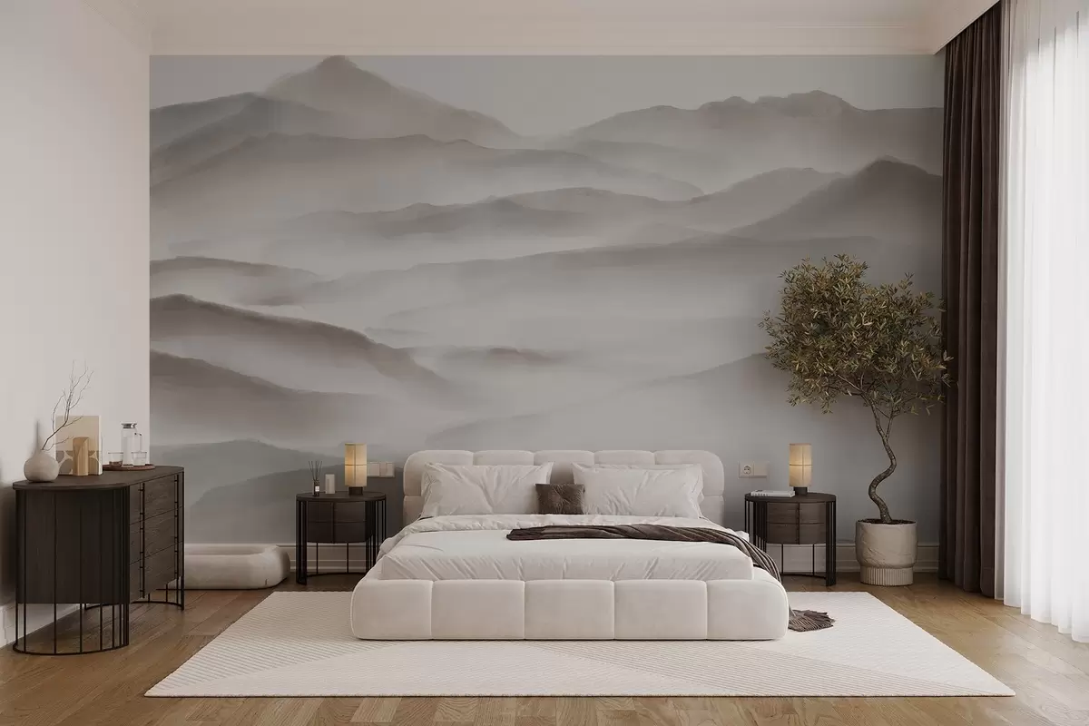 Фотошпалери Мінімалістичний гірський пейзаж з пагорбами і туманом, що створює безтурботний і атмосферний принт w08602