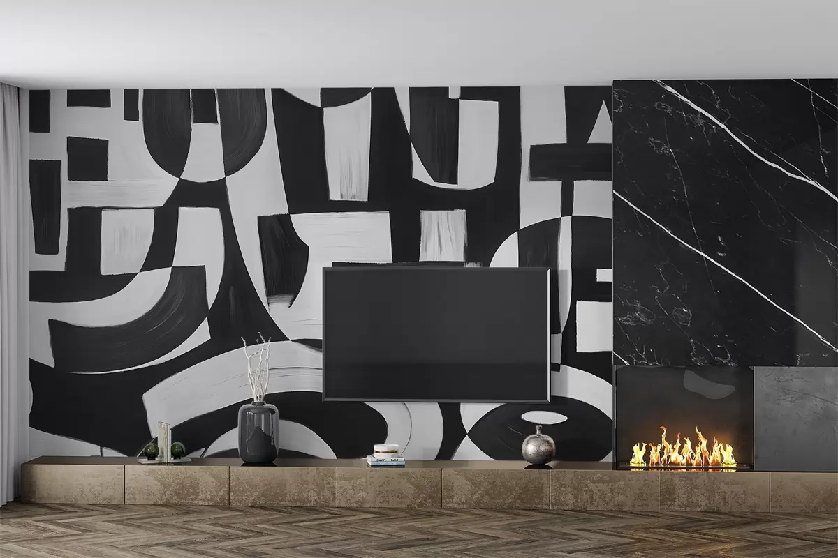 Фотошпалери Абстрактні чорно-білі геометричні фігури та візерунки, що створюють візуально вражаючу та динамічну композицію w08608