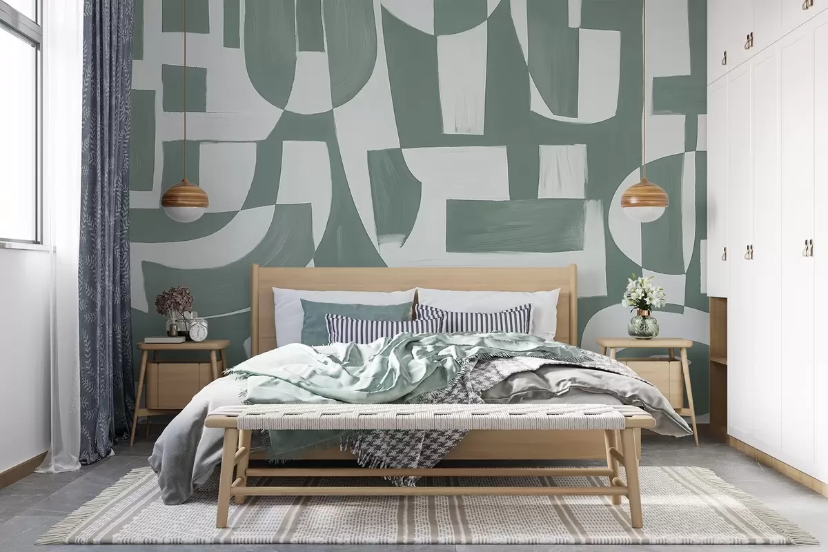Фотошпалери Абстрактні зелені та білі геометричні фігури та візерунки, що створюють візуально вражаючу та динамічну композицію w08608v1