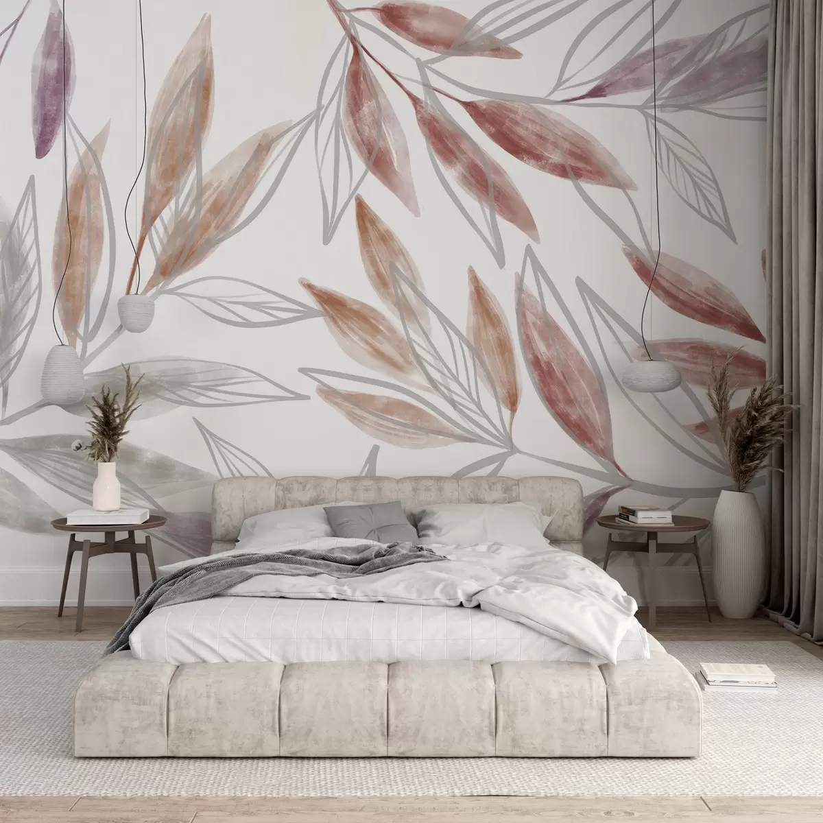 Фотошпалери Ніжні рожеві та сірі фактурні пастельні листя, що створюють безтурботну та мінімалістичну ботанічну композицію w08642