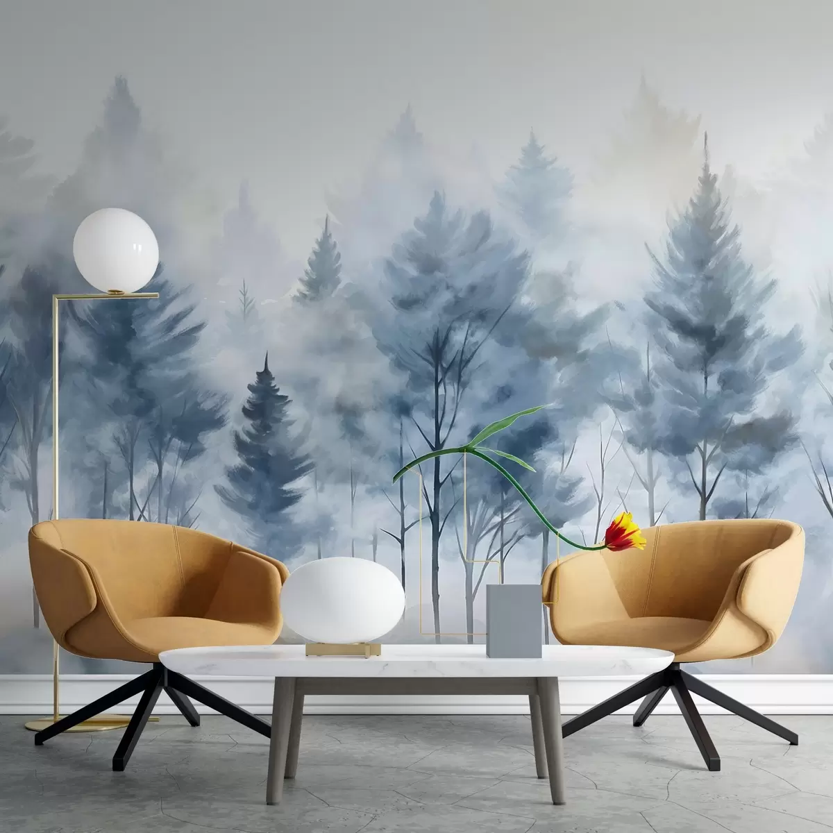 Фотошпалери Туманний лісовий пейзаж з високими соснами та голими листяними деревами на передньому плані в техніці імітації акварелі w08643