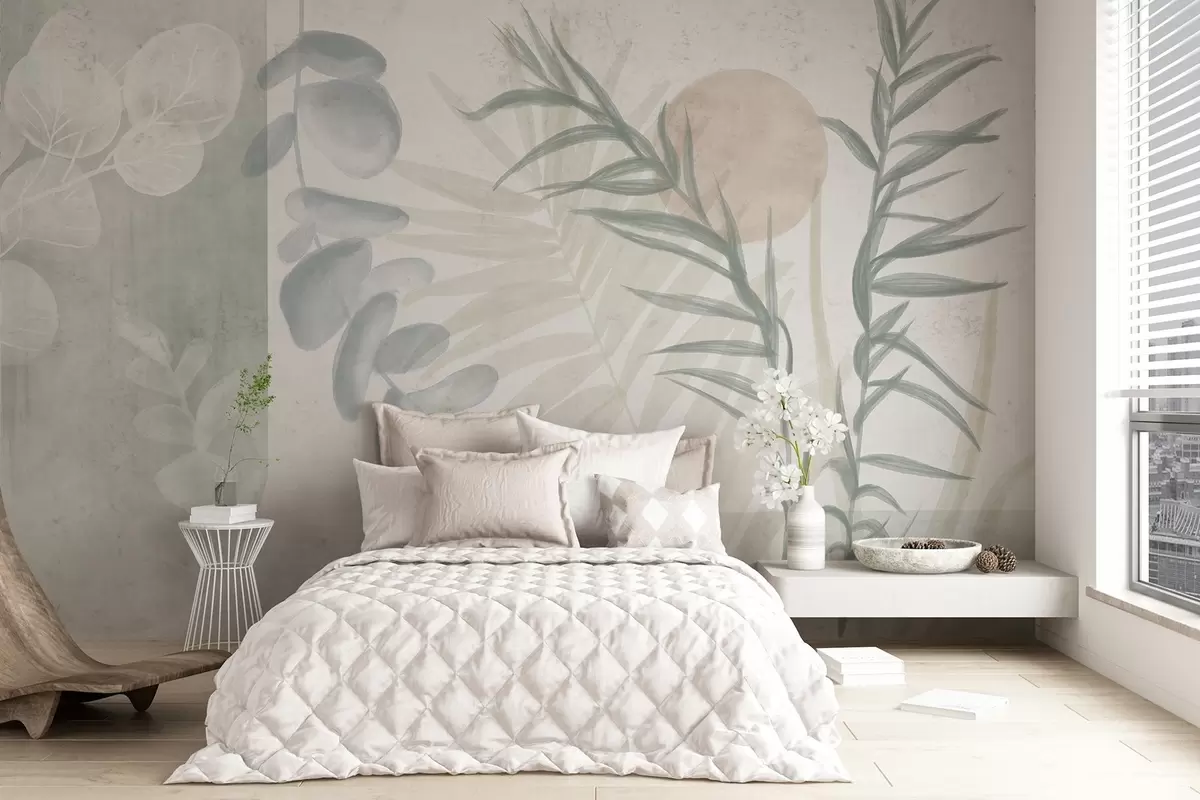 Фотошпалери Мінімалістичний абстрактний принт зі стилізованим листям та евкаліптом із м'якими блакитними органічними формами в приглушених пастельних тонах w08648v1