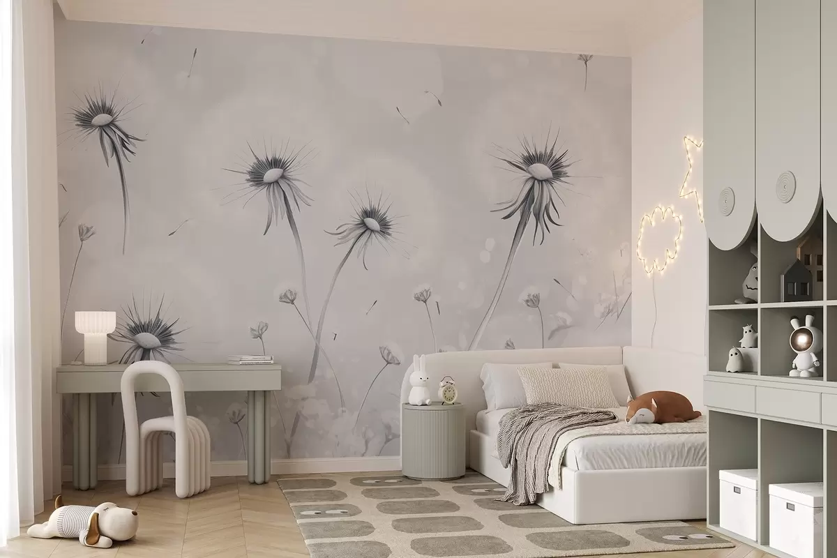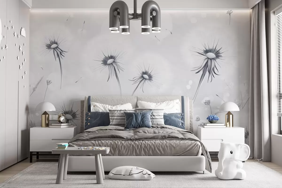 Фотошпалери Елегантні кульбаби та польові квіти в стилі живопису в блакитних тонах w08657v2