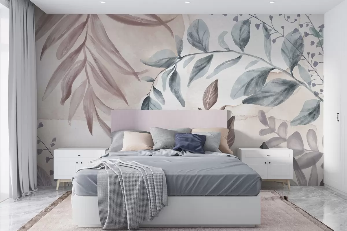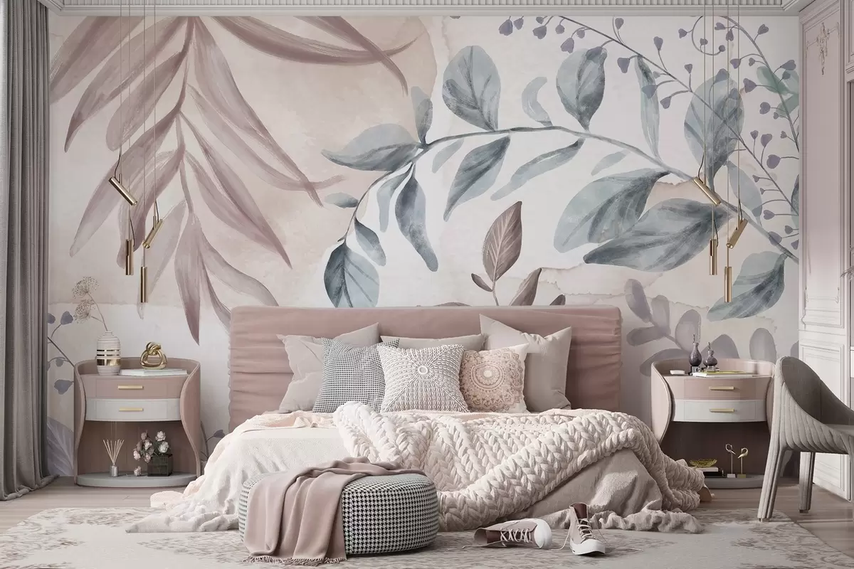 Фотошпалери Ботанічний принт з листям і квітковими гілками в м'яких пастельних тонах, на акварельному тлі w08668