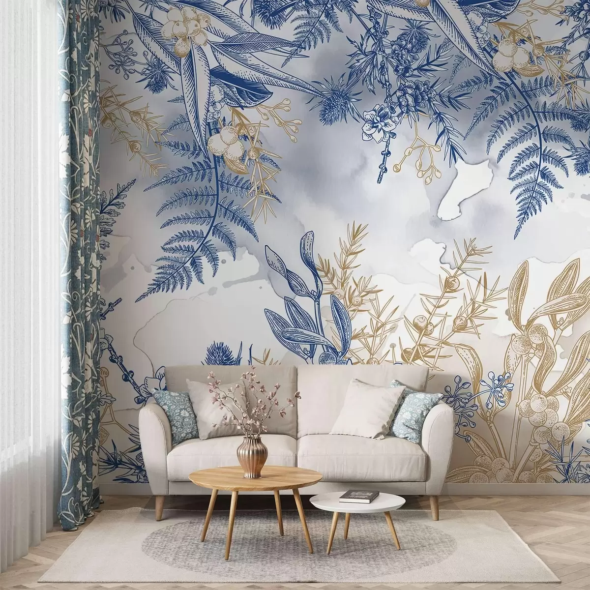 Фотошпалери Квітковий принт із синьо-жовтими ботанічними елементами на світлому, м'якому тлі з акварельними ефектами w08671