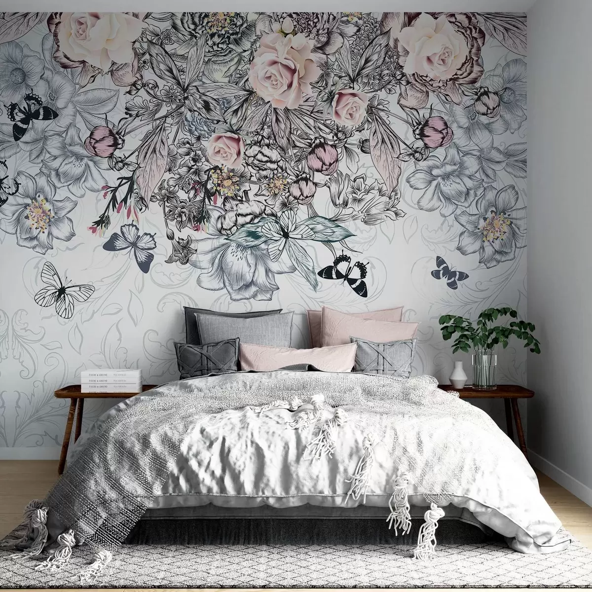 Фотошпалери Квітковий малюнок з рожевими трояндами та різноманітними квітами і метеликами зі складними лініями на фактурному тлі w08674