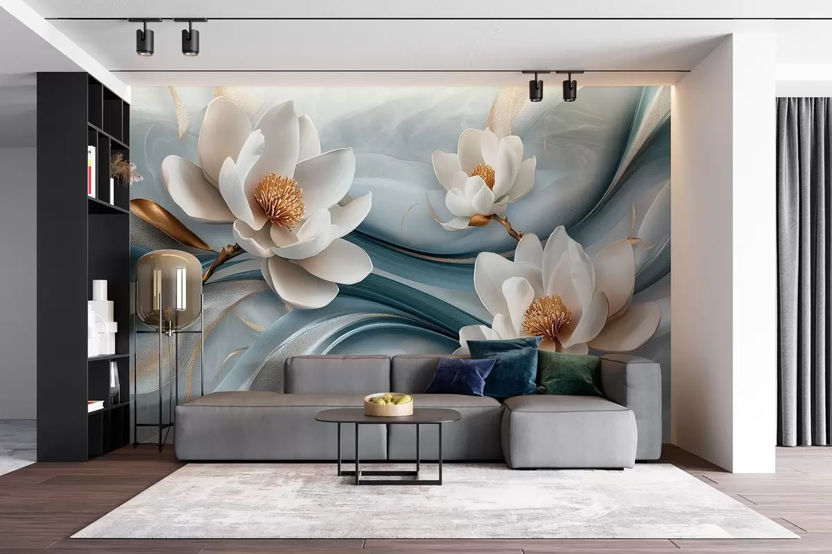 Фотошпалери Квіти магнолії у поєднанні з блакитними, білими та жовтими тонами з абстрактними хвилями w08695