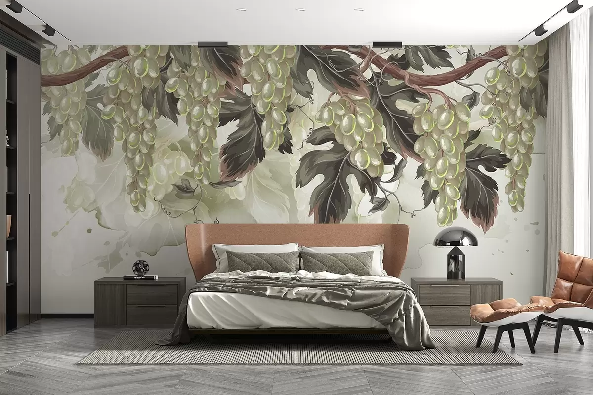 Фотошпалери Виноград, що звисає з лози із зеленим листям, на світлому тлі з акварельними текстурами w08696