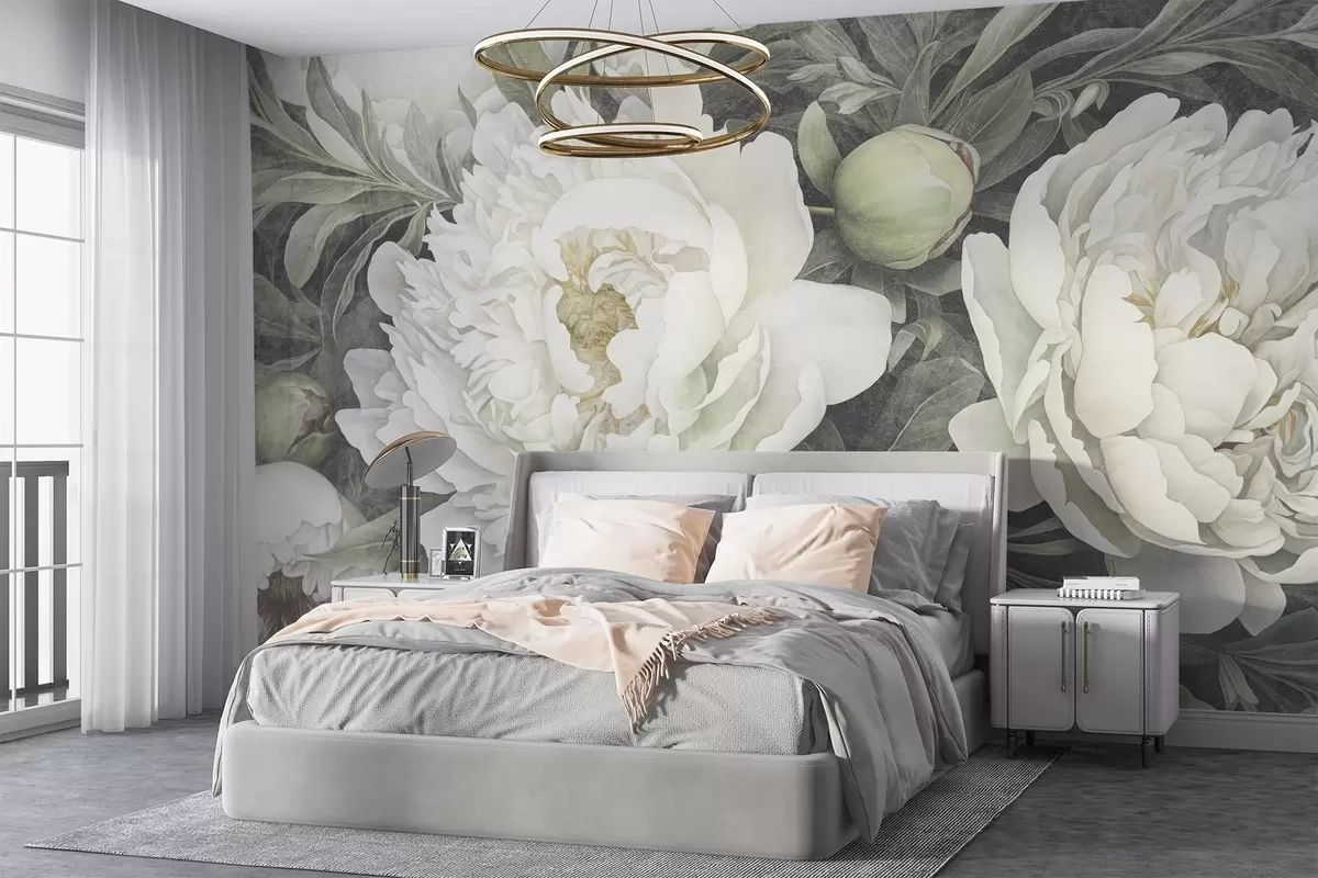 Фотошпалери Текстуровані пастельно-білі півонії з ніжно-зеленими бутонами та листям з ніжними пелюстками w08697