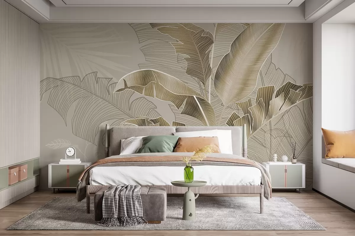 Фотошпалери Гармонійна композиція тропічного листя у відтінках бежевого та коричневого, з детальною роботою ліній w08698