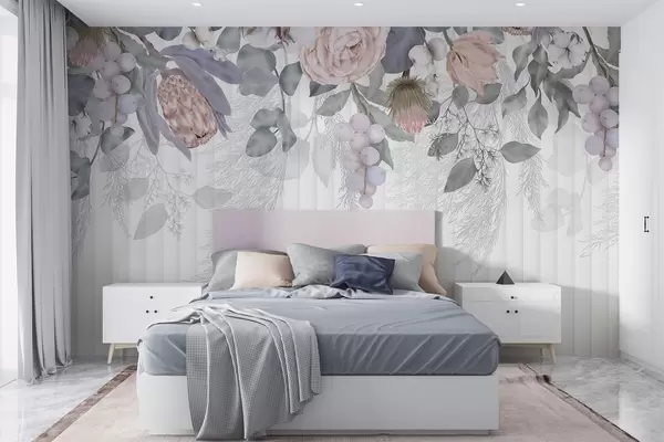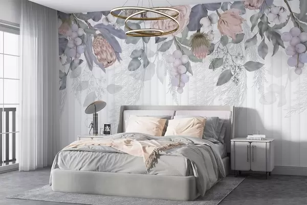 Шпалери Квіткові пастельні рожеві троянди, квіти протеї, гілки евкаліпта та ягоди на фактурному тлі w08700