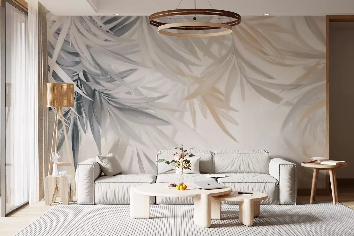 Фотошпалери М'яке, плавне тропічне листя світлих відтінків сірого та персикового, що зливається з блідим, нейтральним принтом w08703