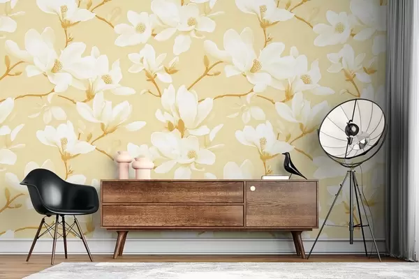 Фотошпалери Візерунок з білих квітів магнолії, в жовтих відтінках, білого листя та гілок w08726v3