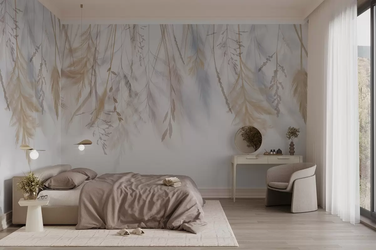 Фотошпалери Ніжні трави, колоски та рослини в пастельних тонах, розташовані каскадним принтом на блідому тлі w08737