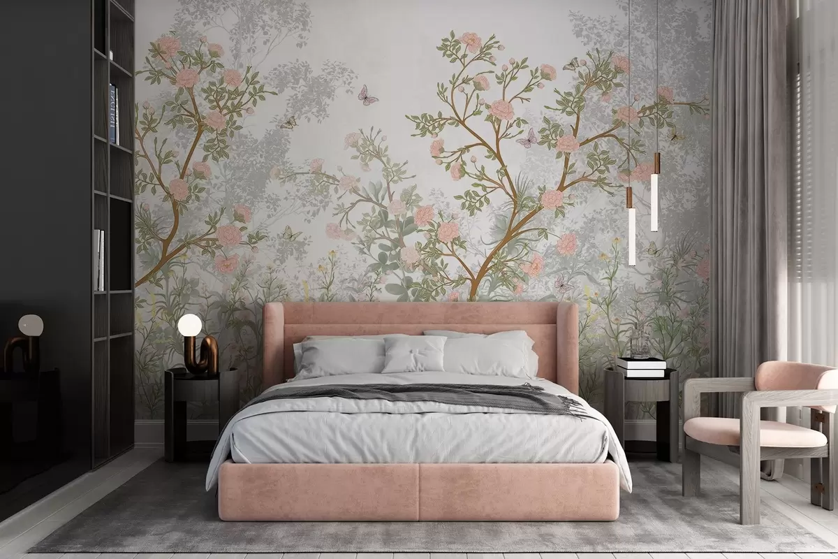 Фотошпалери Ніжно-рожеве цвітіння дерев, пурхаючі метелики та зелене листя, що переплітається зі стрункими гілками w08744