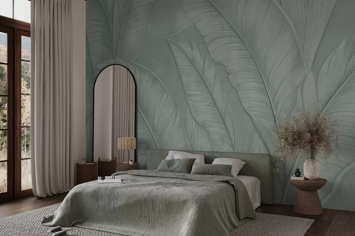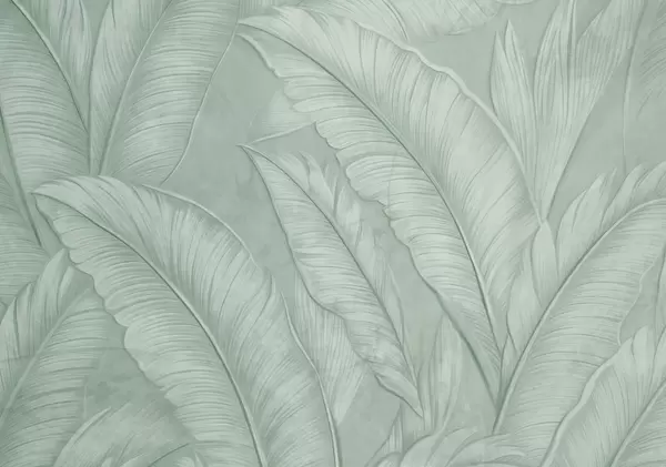 Фотошпалери Високотекстуроване деталізоване велике тропічне листя однотонного зеленого кольору в стилі лофт w08772v1