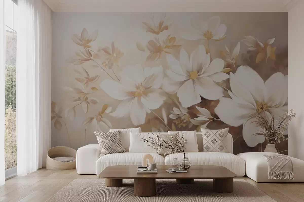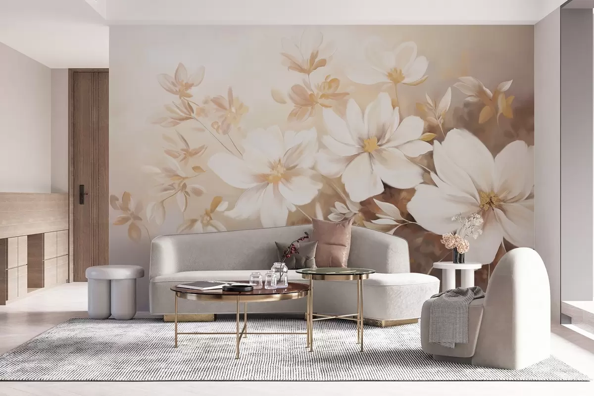Фотошпалери Білі пофарбовані квіти з м'якими пелюстками і ніжним листям, на світло-бежевому і кремовому тлі w08780