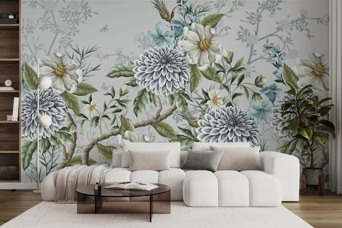 Фотошпалери Квітковий принт із хризантемами, ніжними блакитними квітами та зеленим листям, що переплітається з гілками w08782