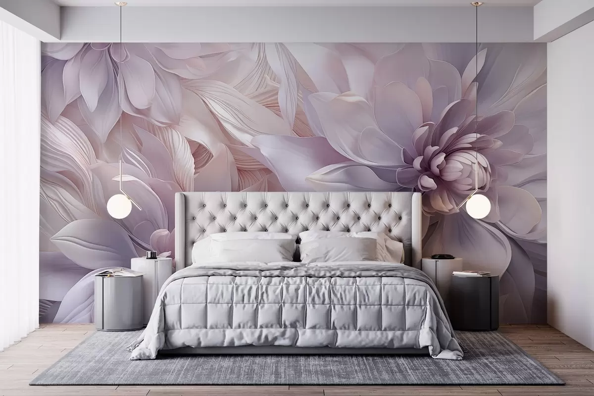 Фотошпалери М'які, багатошарові квіти у відтінках блідо-рожевого, лавандового та білого з ніжними пелюстками та вигадливими деталями w08783