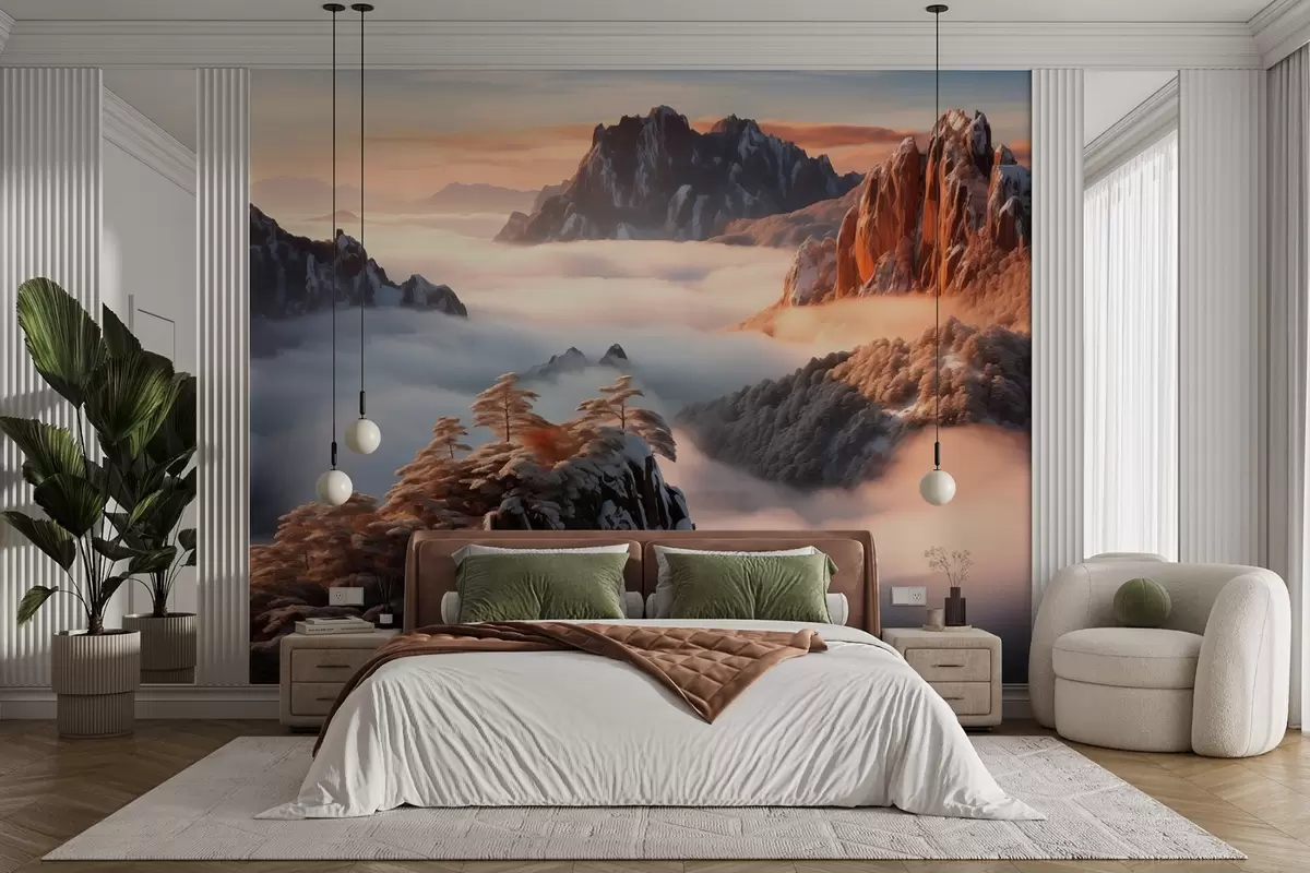 Фотошпалери Чарівний гірський пейзаж з туманом і деревами w08807