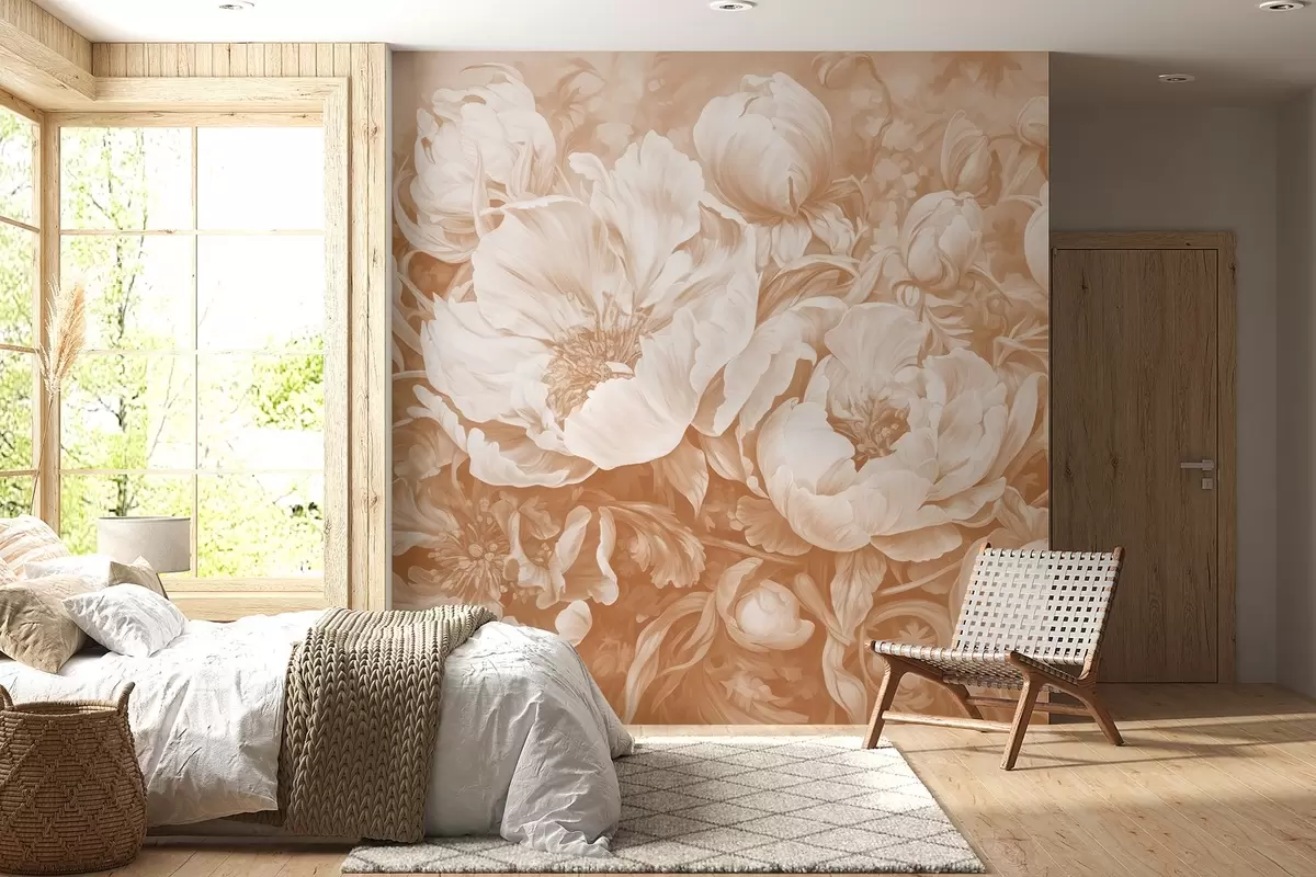 Фотошпалери Тюльпани та півонії, квіткова композиція в стилі бежевого олійного мазка w08817v1