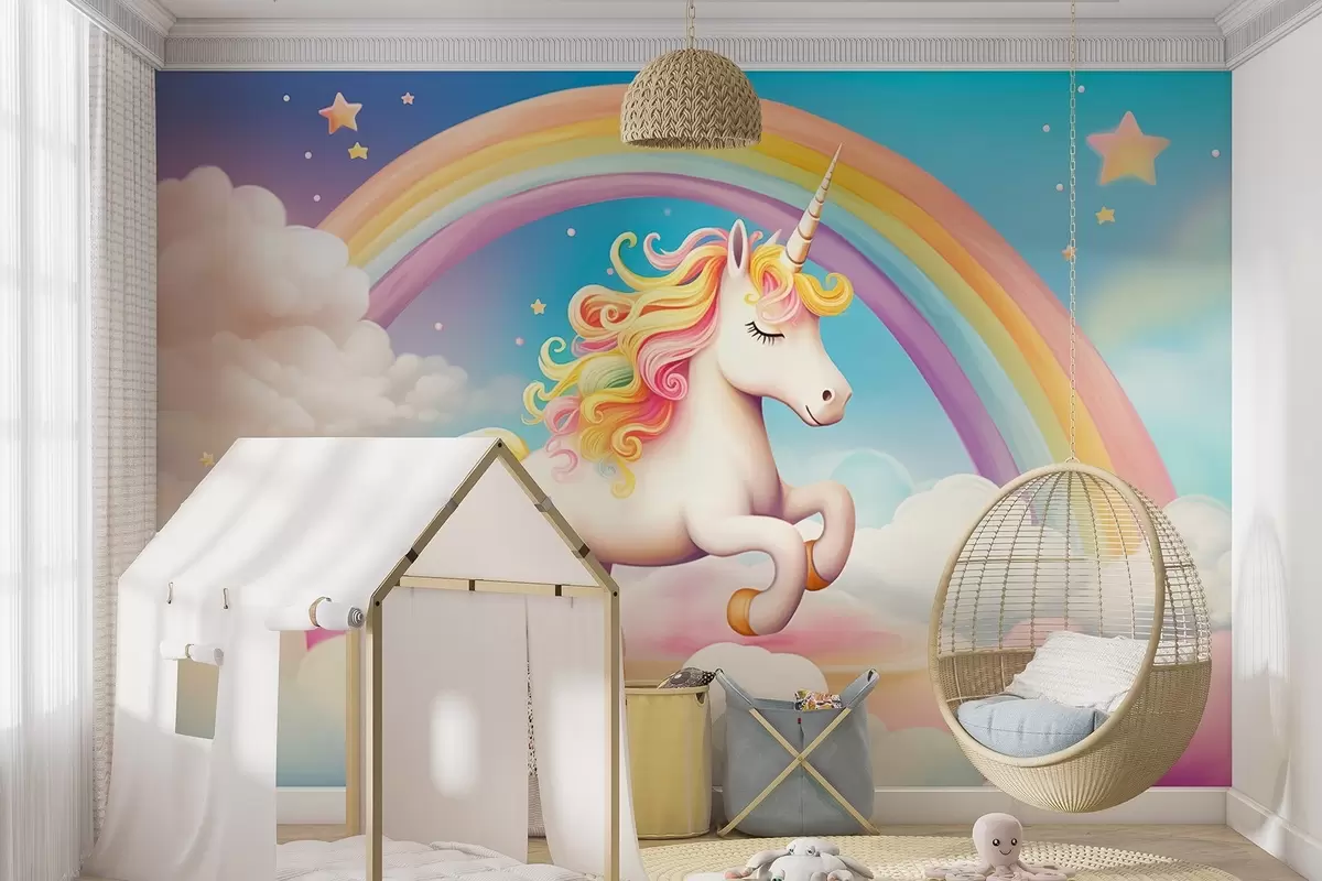 Фотошпалери Кінь-єдиноріг з веселкою, хмарами та зоряним небом w08820