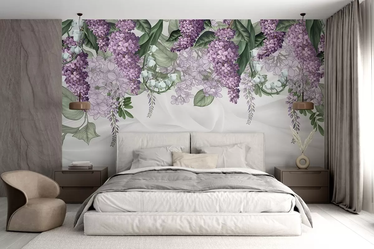 Фотошпалери Пастельні бузкові квіти та зелене листя на білому тлі з імітацією шовкової тканини w08825