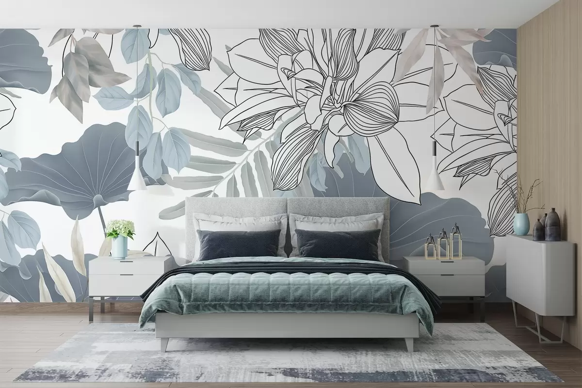 Фотошпалери Квітковий принт з квітами та листям лотоса в синьо-білому кольорі на білому тлі w08827
