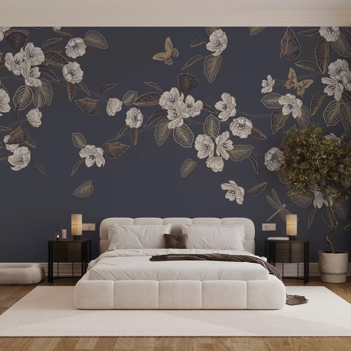 Фотошпалери Квітуча гілка вишні з квітами, листям, метеликами на темно-сірому тлі w08830