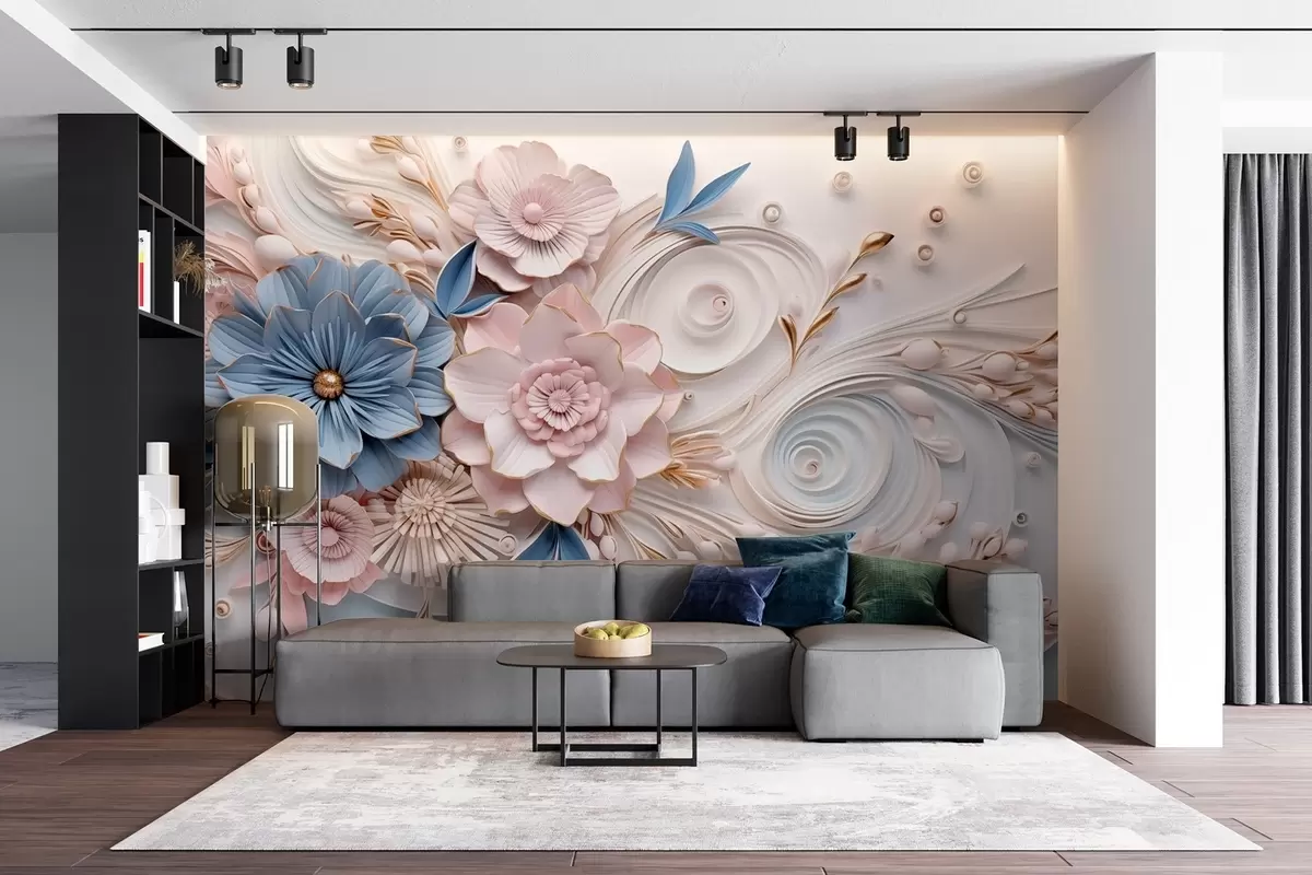 Фотошпалери Ніжна квіткова композиція в рожево-блакитних тонах на м'якому рельєфному тлі w08847