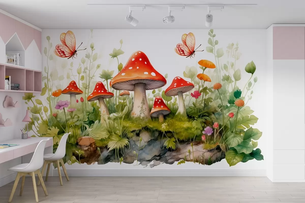 Фотошпалери Лісовий пейзаж на білому тлі в акварельному стилі з грибами, жабами та метеликами w08854