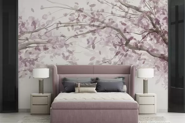 Фотошпалери Квітучі гілки з рожевим листям, м'які кольори, делікатні деталі, акварельний стиль, на світлому фоні w08867
